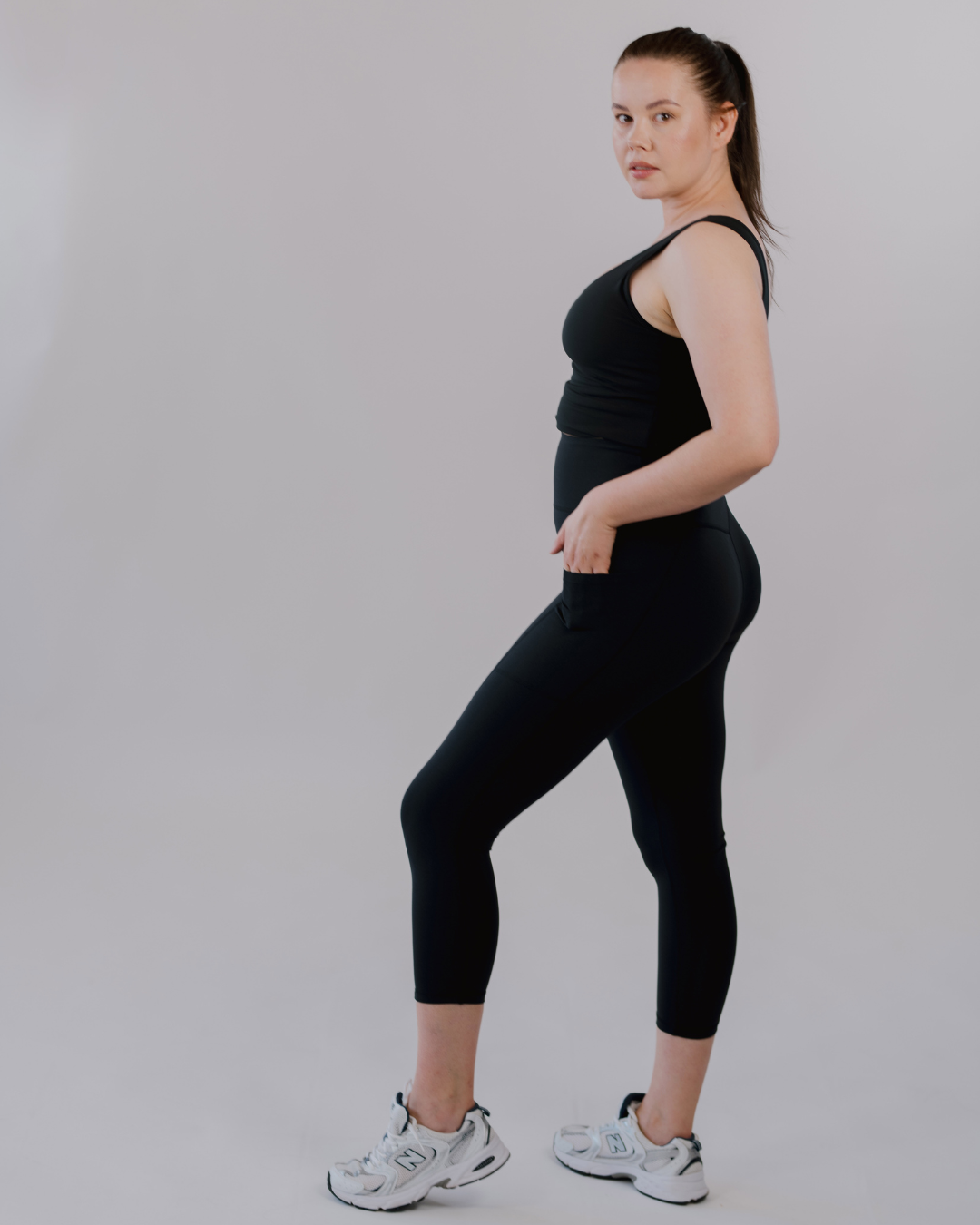 Evom leggings include discreet side pockets. Look for “with pockets” in the product name or description.